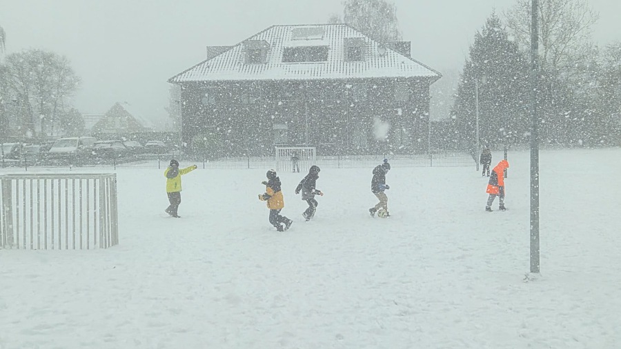 Wenn die Wetterbedingungen es zulassen, gehen wir auch bei Schnee und Kälte auf den Schulhof. Bitte achten Sie darauf, dass Ihr Kind passend für das Spielen im Schnee angezogen ist.