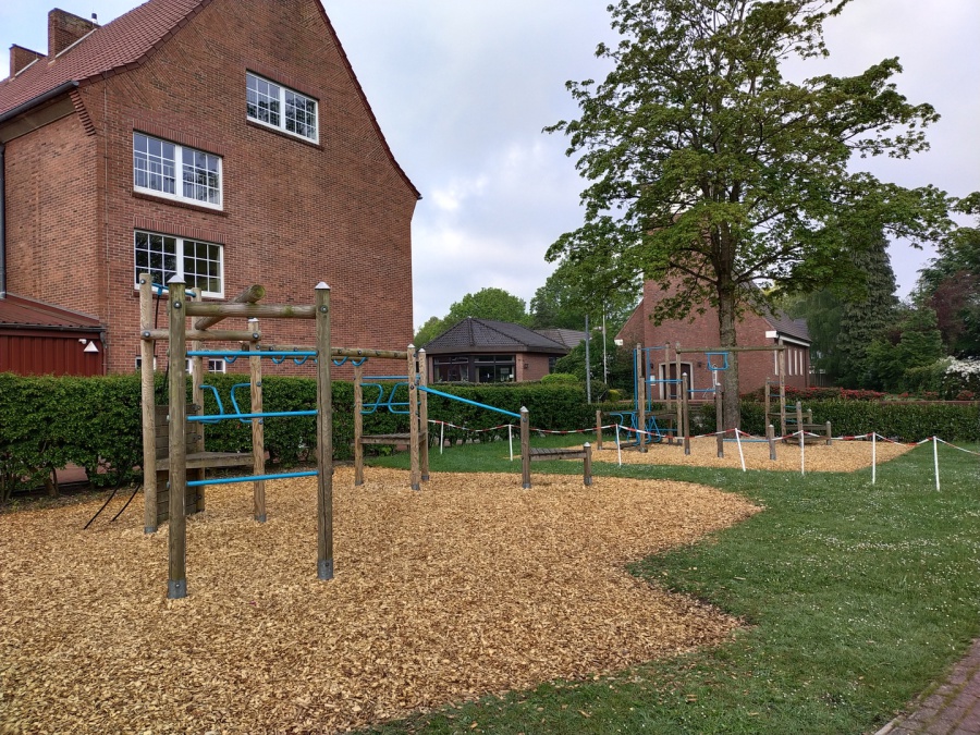 Neben einer großen Grünfläche mit Sandkasten, Schaukel und Klettergerüst, die zum Toben und Spielen einlädt, beinhaltet unser Schulhof eine etwa gleich große Fläche mit einer Tartandecke. Dieses Areal wird im Sportunterricht für die Leichtathletik genutzt sowie in der Pause u.a. zum Fußball-, Hockey- und Basketballspiel.